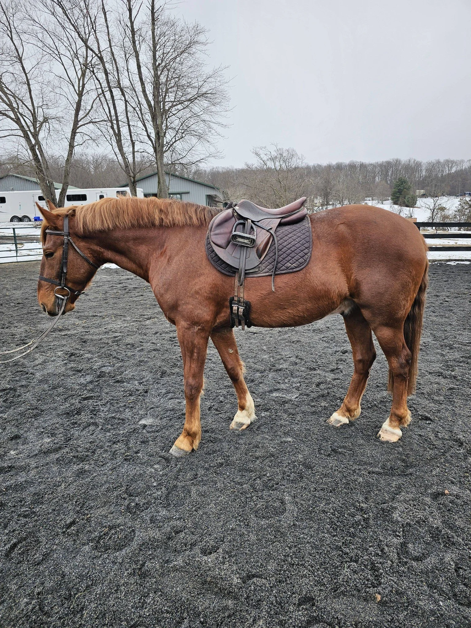 This sweet girl stands on the cross-ties, doesn't mind being alone, easy to catch, good for vet and farrier and just nice to be around!